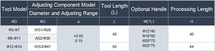 JC-WS series tools are suitable for machines with limited length and processing diameter is Φ3-14mm. When handle diameter at clamping part is large enough, as inner hole of handle is larger than rolling size, processing length will be of no limit.